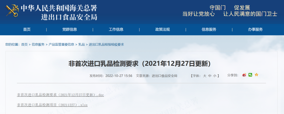非首次进口的乳品,应当提供首次进口检测报告的复印件以及海关总署要求项目的检测报告。非首次进口检测报告项目由海关总署根据乳品风险监测等有关情况确定并在海关总署网站公布(网址:http://jckspj.customs.gov.cn/spj/xxfw39/cpjgzyxx/rp/jckrpjyjyyq/4645075/index.html)。
