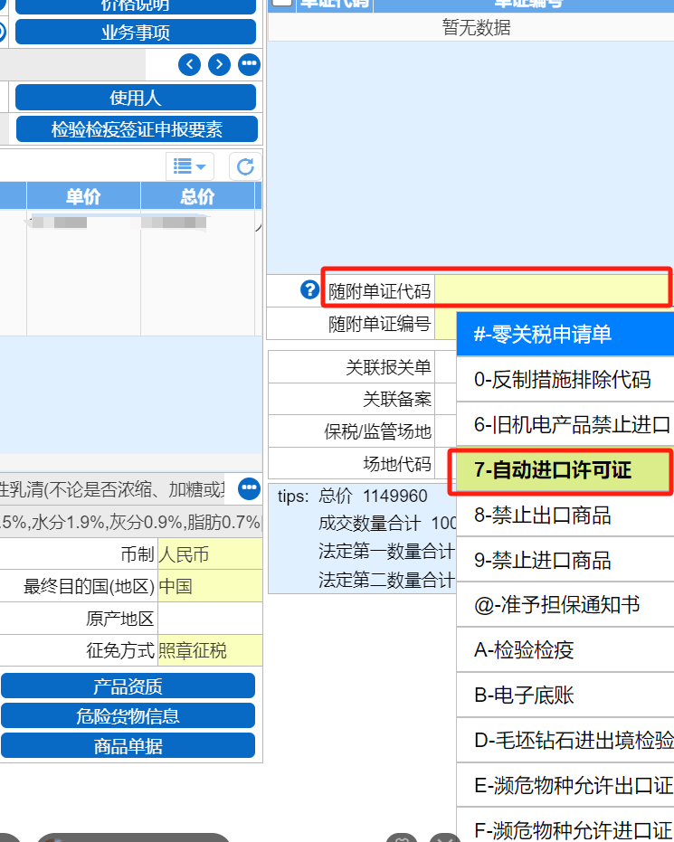 申报的商品编码涉及自动进口许可证的,应先在商务部办理自动进口许可证(在“随附单证代码”录入“7”并录入随附单证编号)