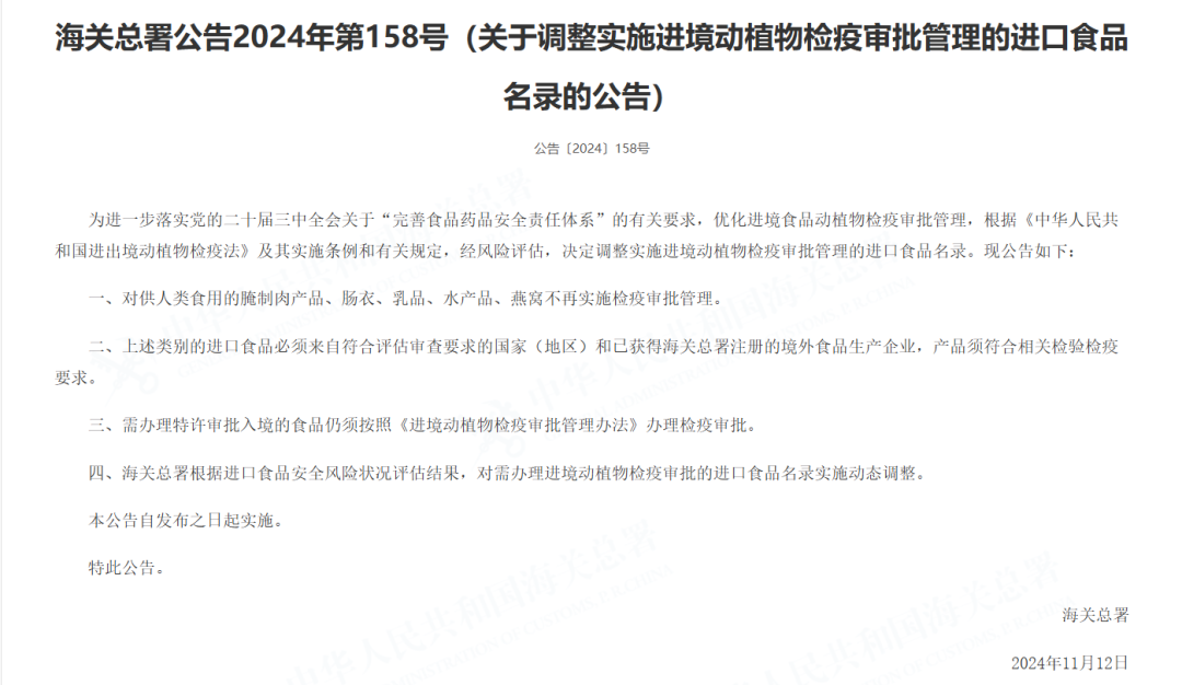 〔2024〕158号)的规定,自2024年11月12日起,供人类食用的进口乳品不再实施检疫审批管理。