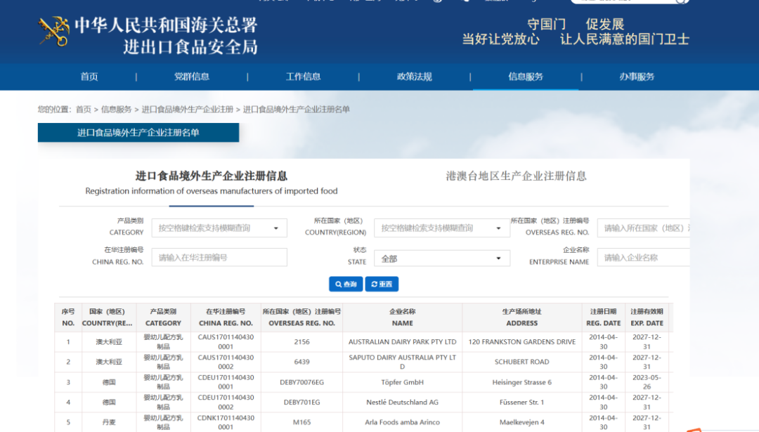 向中国境内出口乳品的境外生产企业应由所在国家(地区)主管当局向海关总署推荐注册,通过海关总署的注册后方可向中国出口。已经注册的企业信息以“进口食品境外生产企业注册名单”在海关总署网站公布(查询地址:http://jckspj.customs.gov.cn/spj/xxfw39/jkspjwscqyzcmd/4650504/index.html)。