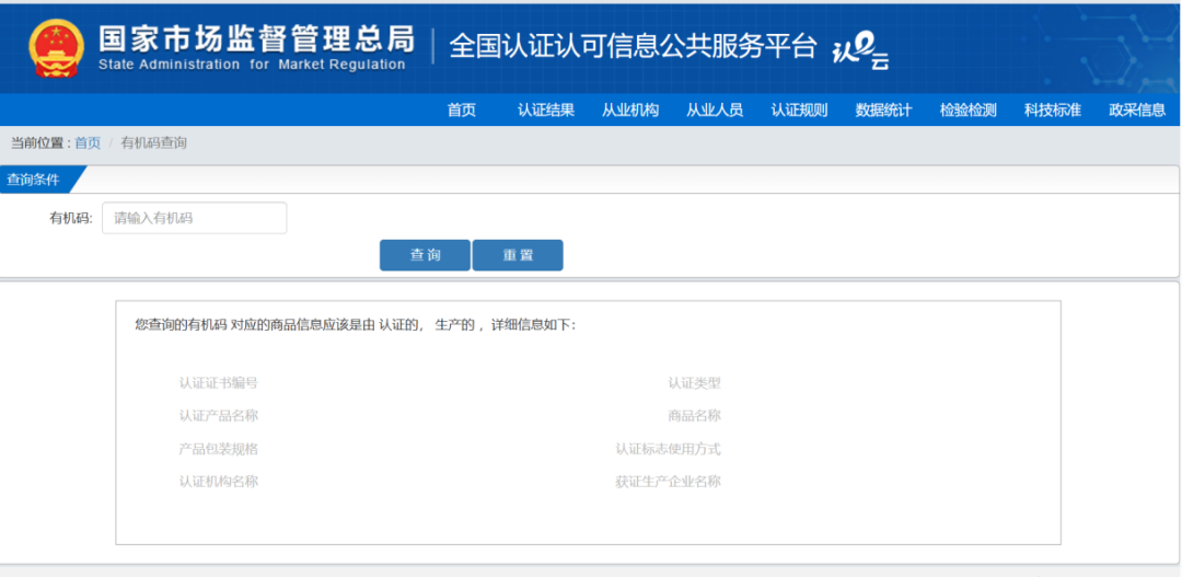 产品标签标示“有机”的进口食品,必须持有中国有机产品认证证书、有机产品销售证,且证书应能够在“中国食品农产品认证信息系统”(查询地址:http://ogasearch.food.cnca.cn/oga/query/index.jsp)中验证相关证书信息(包括企业名、证书覆盖范围、有效日期等)的一致性。