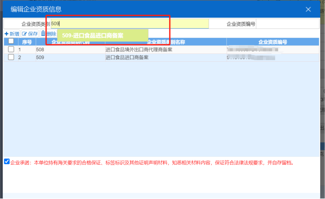 1.4境外生产企业注册编号(在“产品资质”中增加519-《进口食品境外生产企业注册》并输入证书编号)